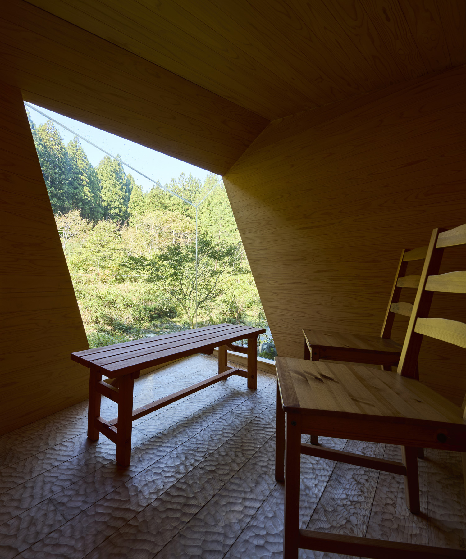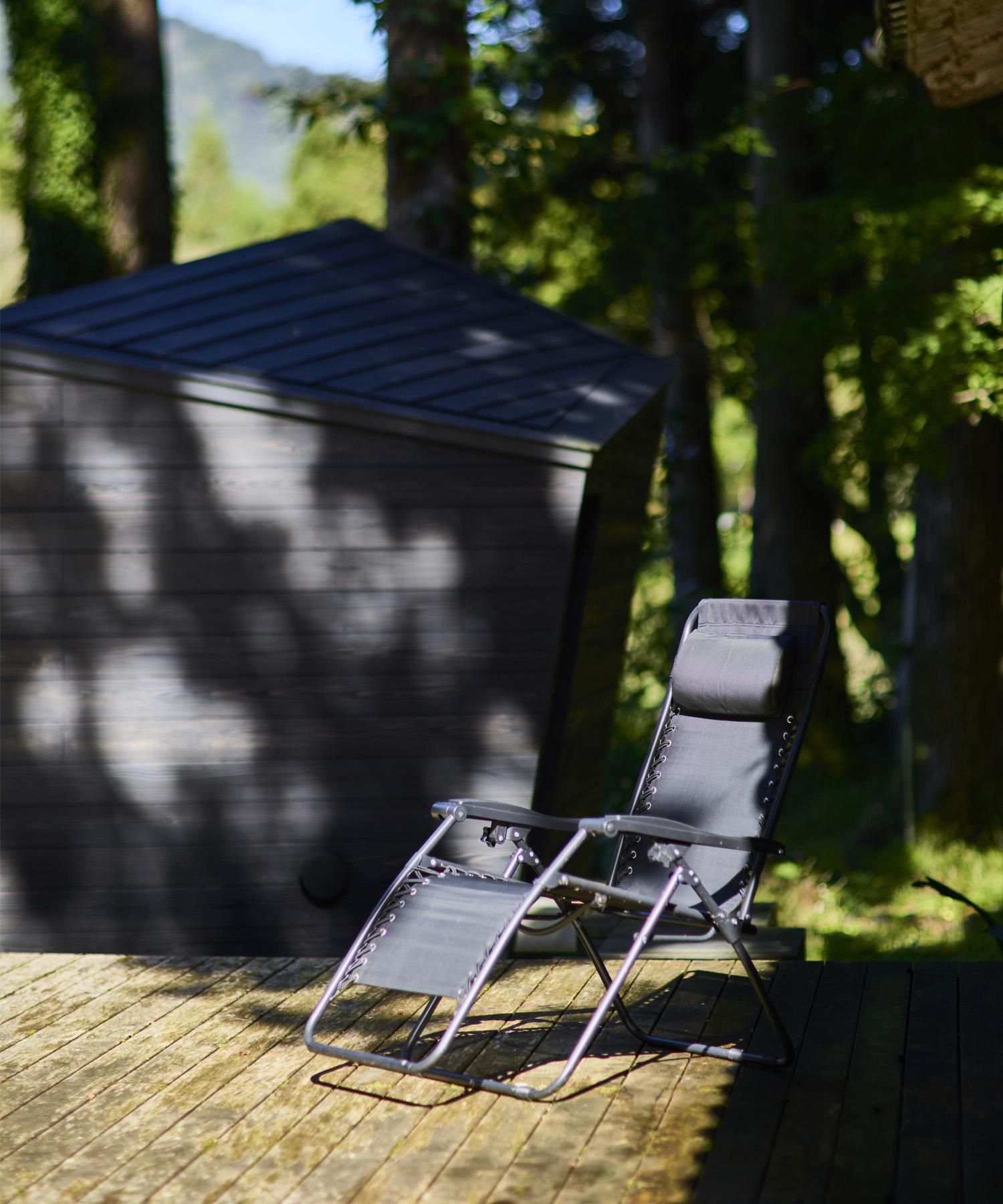 KUDARI features a striking black exterior and includes a private sauna. Inside, the gentle scent of cypress wood fills the air, and sauna stones compatible with self-löyly are provided. Experience a luxurious sense of renewal with a cold plunge bath utilizing natural river water and a wood deck where cool breezes flow through.